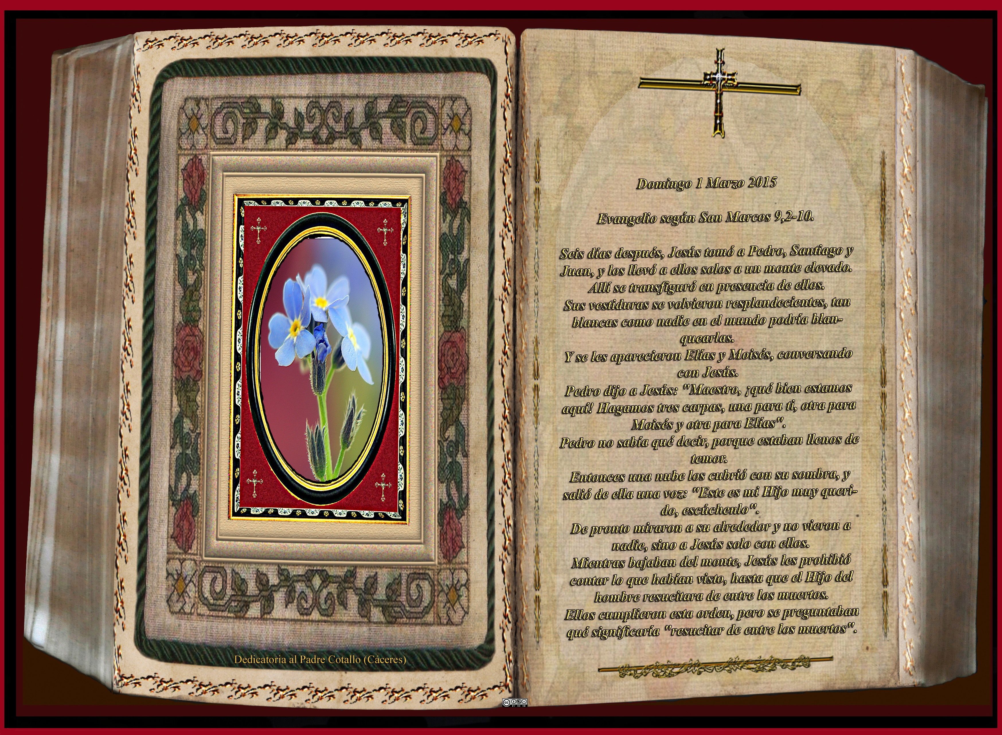 Seis días después, Jesús tomó a Pedro, Santiago y Juan, y los llevó a ellos solos a un monte elevado. Allí se transfiguró en presencia de ellos.